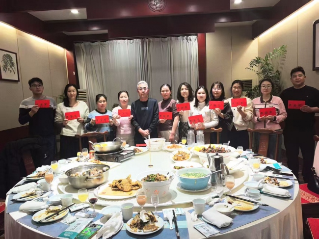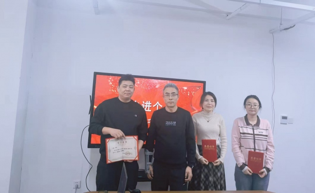 会议中公司王总为“先进个人”颁发了荣誉证书,会后公司全体员工进行年会聚餐并发放奖金。